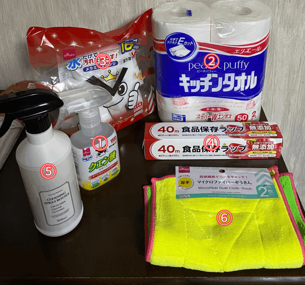 - クエン酸スプレーやメラミンスポンジなど、100均アイテム一式の使いどころがわかります。